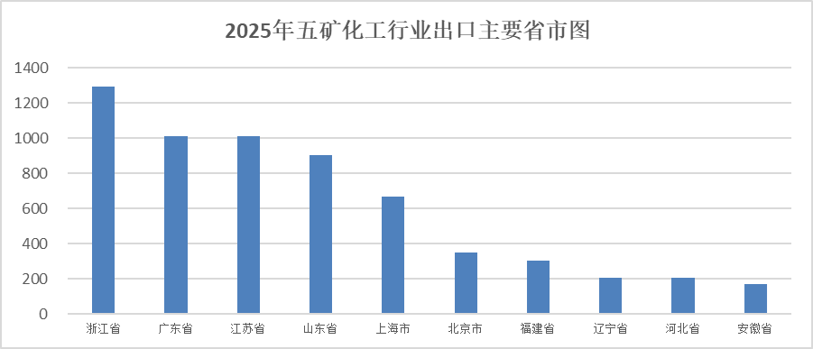 2025年五矿化工行业浙江省出口1295亿美元,增长3.6%,所占比重为17.3%;广东省出口1010亿美元,下降9.2%,所占比重为13.5%;江苏省出口1009亿美元,增长6.4%,所占比重为13.5%;山东省出口901亿美元,增长4%,所占比重为12%;上海市出口669亿美元,增长28.1%,所占比重为8.9%。