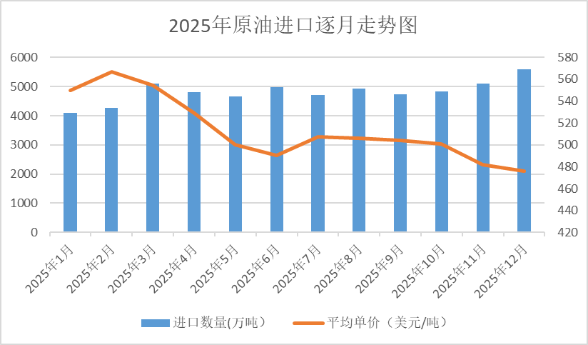 原油进口数量呈波动上升走势。1月份进口4106万吨,为年度最低值。12月份进口5597万吨,为年度最高值。原油进口价格呈波动下降走势。2月份进口均价为567美元/吨,为年度最高值。12月份进口均价为476美元/吨,为年度最低值。
