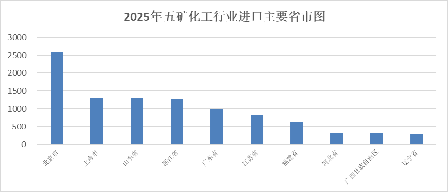 2025年五矿化工行业北京市进口2584亿美元,下降13.9%,所占比重为21.6%;上海市进口1304亿美元,增长1.4%,所占比重为10.9%;山东省进口1291亿美元,增长6.8%,所占比重为10.8%;浙江省进口1276亿美元,下降5.1%,所占比重为10.7%;广东省进口989亿美元,下降1.6%,所占比重为8.3%。