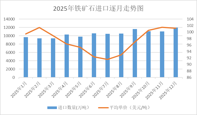 铁矿石进口数量呈波动上升走势。3月份进口9376万吨,为年度最低值。12月份进口11965万吨,为年度最高值。铁矿石进口价格呈先降后增走势。1月份进口均价为99美元/吨,2月份涨至101美元/吨,之后价格一路下跌,6、7月份进口均价都为92美元/吨,之后价格开始上涨,10、11、12月份进口均价都为101美元/吨。