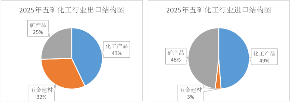 2025年五矿化工行业出口中,化工产品出口3215亿美元,增长3.4%,占行业出口总额的42.9%;五金建材出口2374亿美元,增长3.1%,占行业出口总额的31.7%;矿产品出口1906亿美元,增长11.6%,占行业出口总额的25.4%。